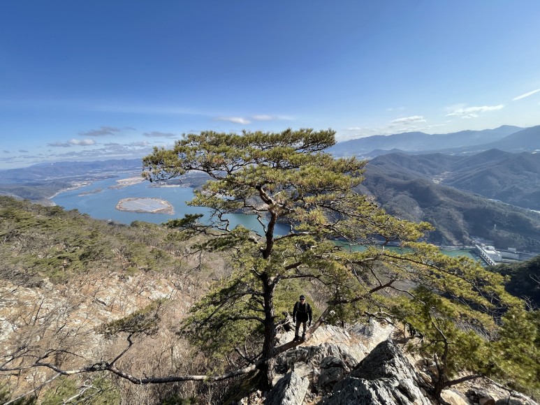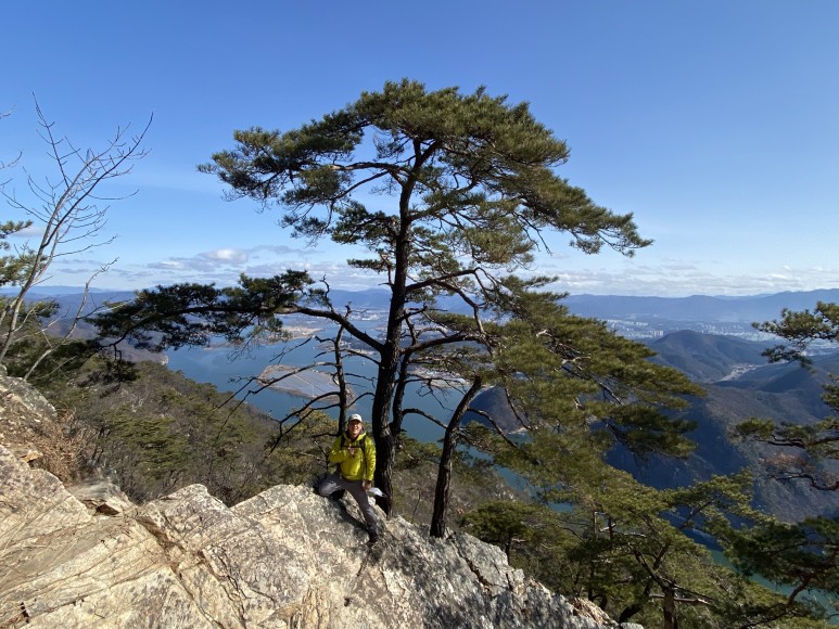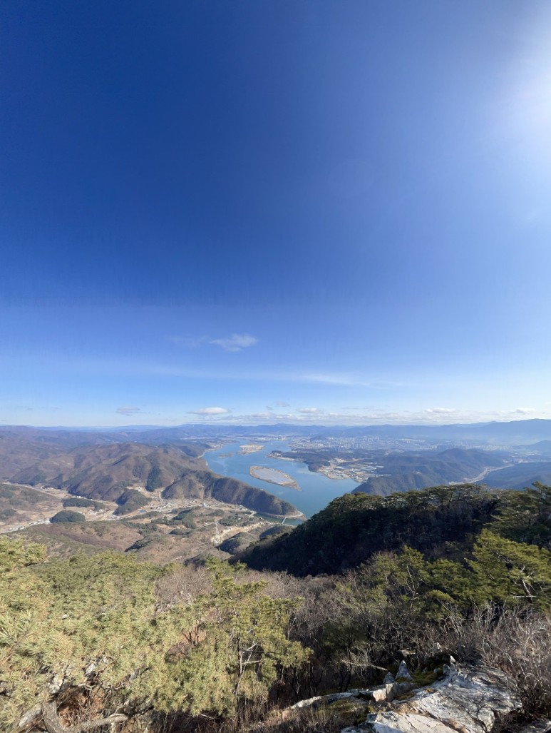 1~2시간 올라가다 보니 금방 정상에 올랐다. 저 멀리 붕어섬도보이고. 탁 트인 경치가 아주 좋다.