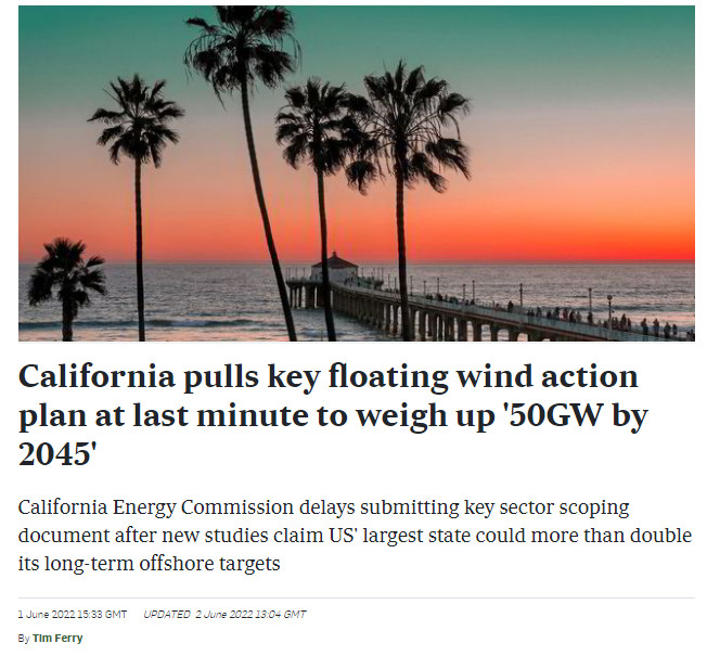 - 캘리포니아 에너지 위원회(Califonia Energy Commision)는 부유식 풍력 발전을 50GW로 늘리기 위해서 20GW의 기존 목표를 철회 했다.