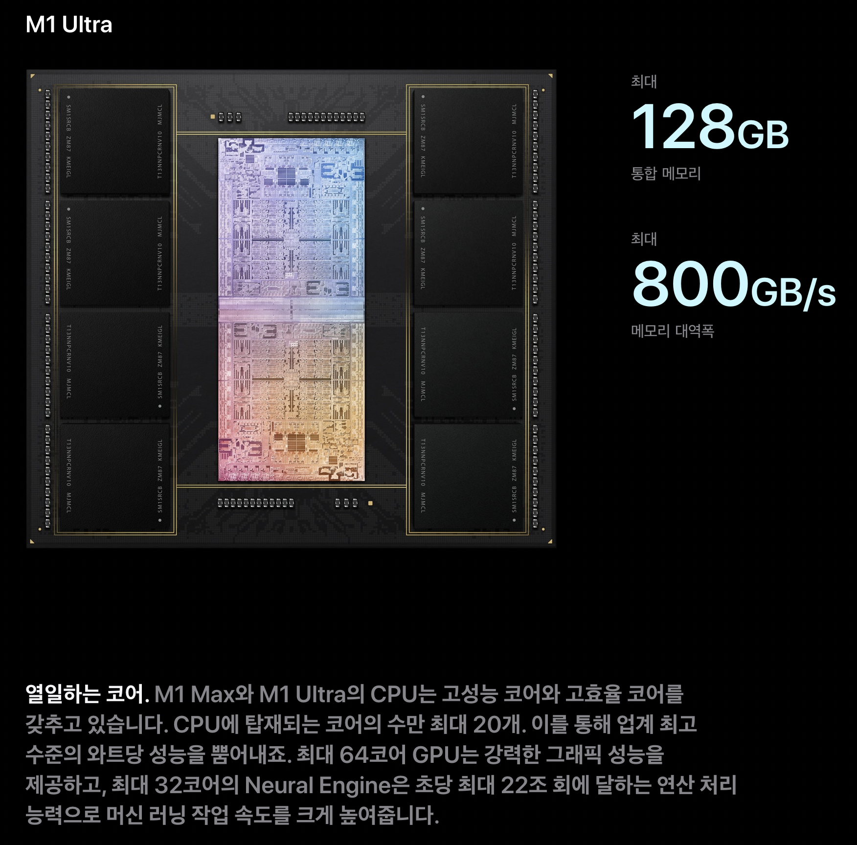 기존의 m1 max 프로세서를 2개 배치하여 기존의 맥 프로의 포지션을 뛰어넘는 프로세서를 장착해버림.