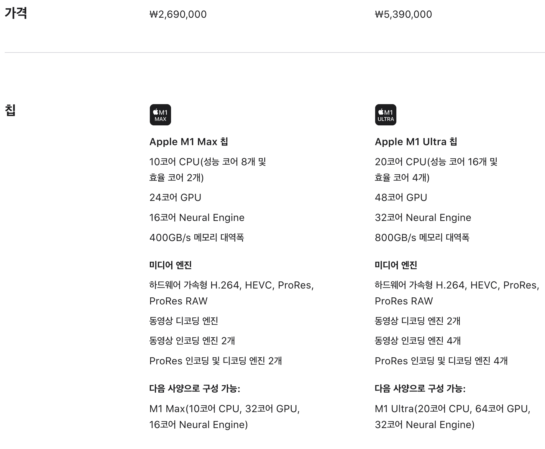 기존의 m1 max 프로세서를 2개 배치하여 기존의 맥 프로의 포지션을 뛰어넘는 프로세서를 장착해버림.