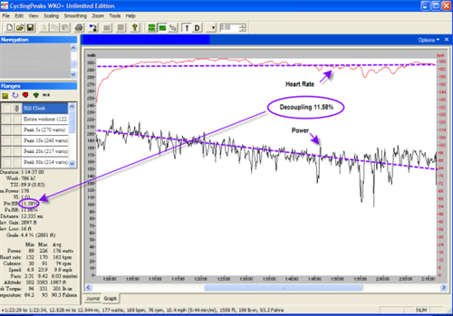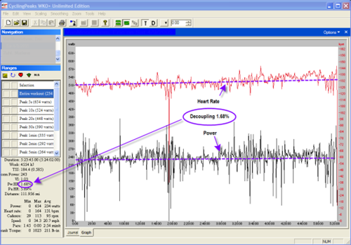 WKO+ 소프트웨어는 디커플링 수준을 표시하고 측정하여 유산소 지구력 조절 정도를 결정하는 데 도움을 줄 수 있습니다. 훌륭한 수준의 유산소 운동을 달성하면 WKO+의 심박수와 파워 또는 속도 그래프가 평행하거나 거의 평행을 이룹니다. 다음은 WKO+ 소프트웨어를 사용하여 디커플링을 결정하는 방법입니다.