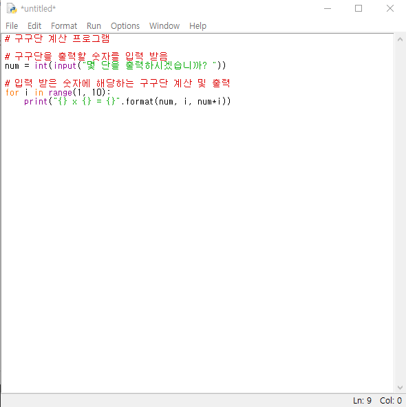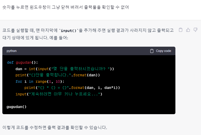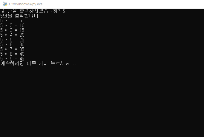 질문: 구구단을 계산하는 프로그램을 만들어줘. 파이썬