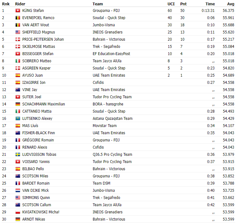 스테판 쿵은 투르 드 스위스 개인 타임 트라이얼에서 세 번째로 우승을 차지하며 정상급 경쟁자들과 함께 스위스에서 기쁨을 만끽했습니다."우승이라는 큰 짐을 내려놓게 되어 정말 기쁩니다. 큰 레이스에서 우승에 여러 번 근접했었죠. 오늘 이 정도면 충분하다는 생각에 만족감을 느낍니다. 가족 앞에서, 그리고 스위스에서 우승하는 것보다 더 좋은 것은 없습니다." 개인 타임트라이얼에서 강세를 보였지만 쿵은 고산 훈련 캠프 직후 투어에 참가해 아직 100% 컨디션이 아니었기 때문에 이번 우승은 다소 의외로 다가왔습니다. 쿵은 우승 후 작년과 마찬가지로 종합 순위 경쟁에 나설지 여부에 대해 "가능한 한 오랫동안 져지를 지키고 싶습니다. 내일도 노트빌에서 가능할 것입니다. 그리고 매일매일 지켜보겠습니다.". 작년에는 투어 스페셜리스트로 분류되지는 않지만 종합 5위에 올랐습니다.