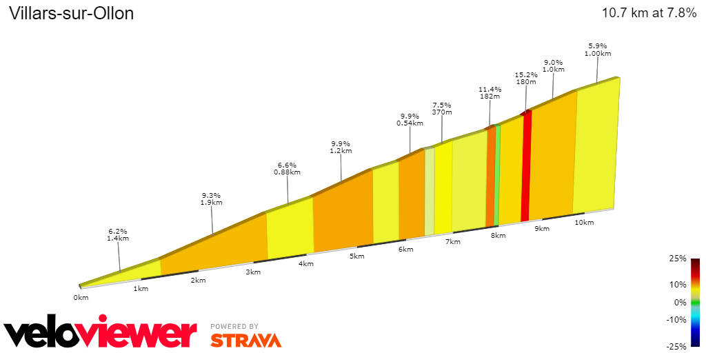 이 구간은 엄청난 와트 소모가 예상되는 구간입니다. 평온한 날, 일정하지만 가파른 오르막길인 빌라르 쉬르 올롱에서는 불꽃놀이를 볼 수 있습니다. 7.8%의 10.7km로 지속적인 오르막이지만 몇 가지 헤어핀이 있는 구간입니다. 이 오르막에서 중요한 격차가 벌어질 것이므로 종합 우승을 위해 이 오르막을 공략해야 하는 선수들은 반드시 이 구간을 공략해야 합니다.