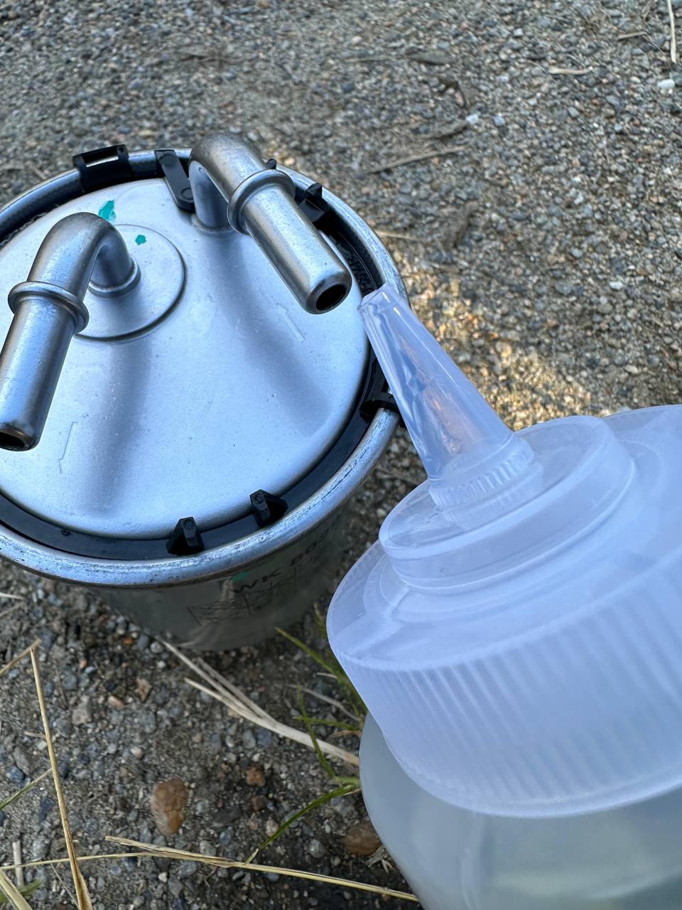 소스통에 담긴 경유를 새 연료 필터에 잘 넣어 준다.