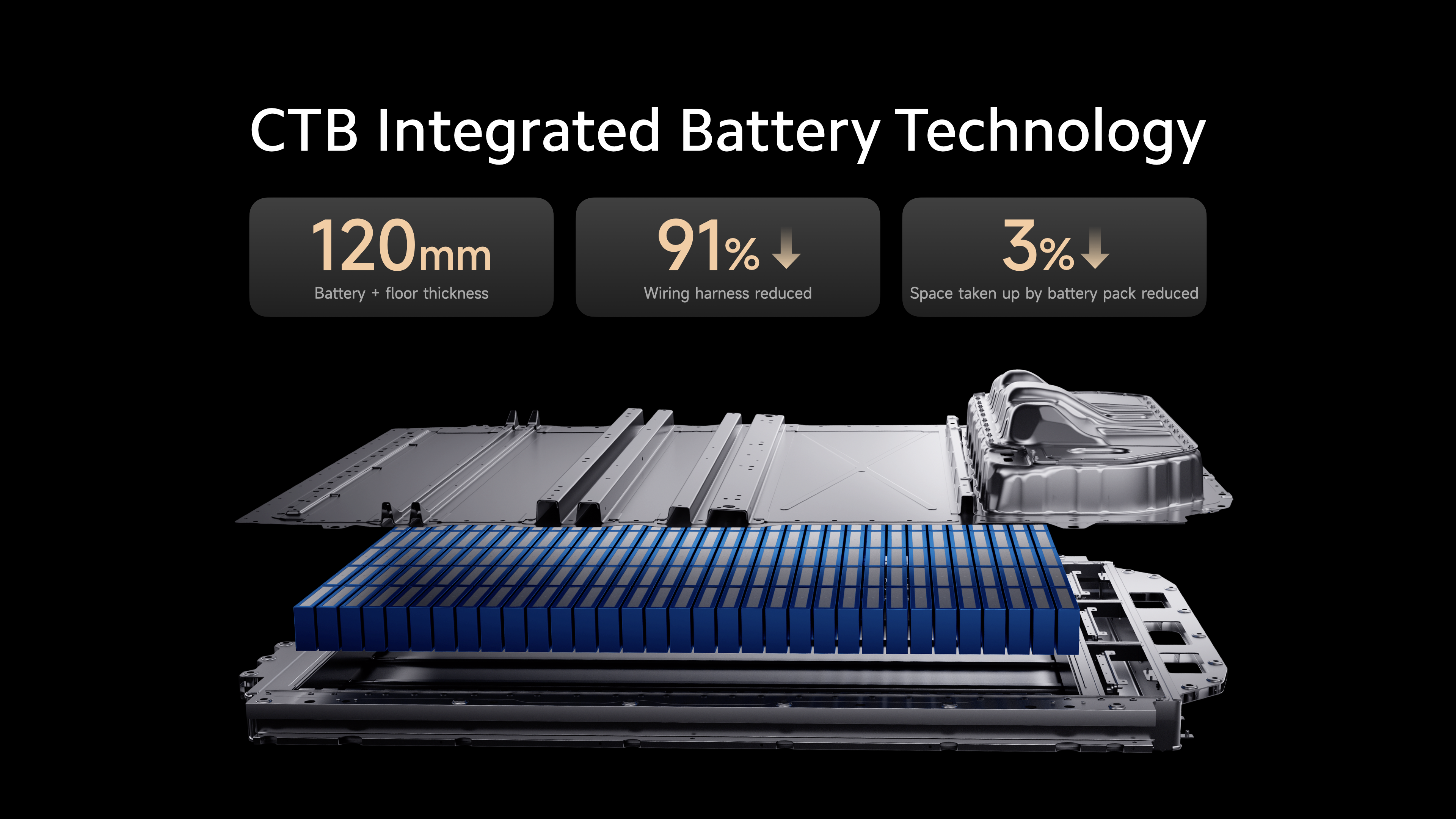 샤오미는 혁신적인 인버티드 셀 기술, 다기능 탄성 중간층, 최소한의 배선 시스템을 통해 자체 개발한 CTB 통합 배터리 기술을 통해 전 세계 CTB 배터리 중 가장 높은 77.8%의 배터리 통합 효율, 24.4%의 전반적인 성능 향상, 17mm의 높이 감소, 최대 배터리 용량 150kWh, 이론적 CLTC 충전 범위 1200km 이상의 기능을 갖추고 있습니다.