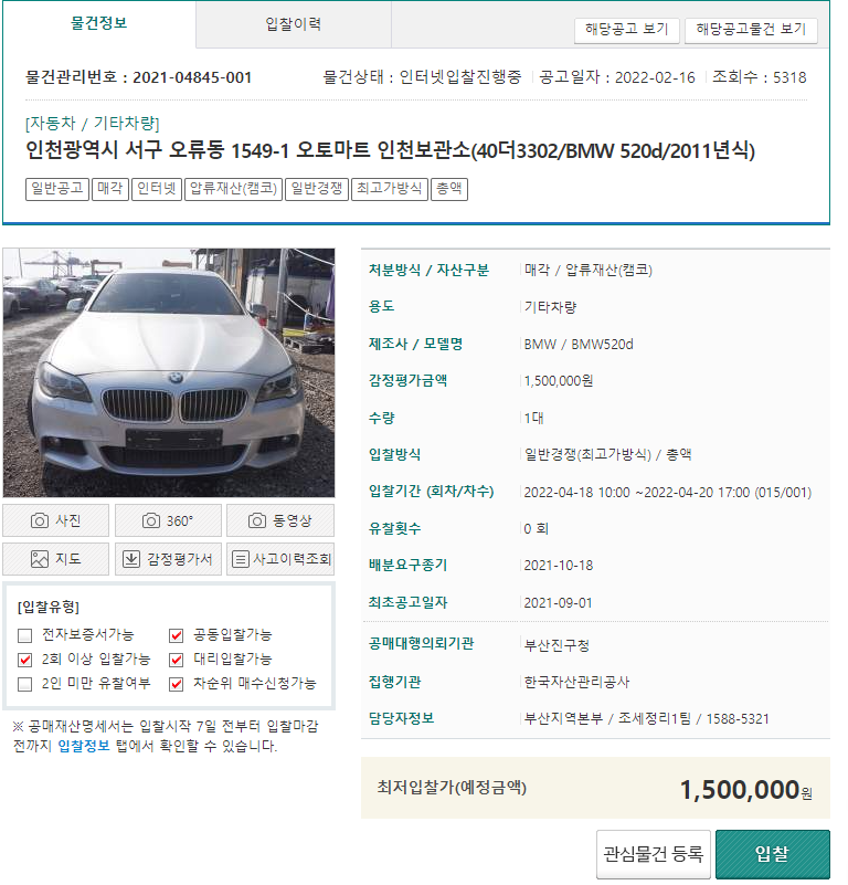 | 인천광역시 서구 갑문1로 37 오토마트 인천보관소(40더3302/BMW 520d/2011년식, 오류동) |